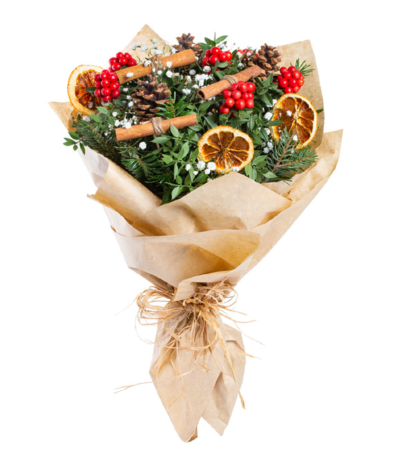 Doğal Kraft Kâğıtta Kokina Buketi Yeni yılın sıcaklığını ve umudunu sevdiklerinize en doğal haliyle sunmaya ne dersiniz? Doğal Kraft Kâğıtta Kokina Buketi, kokinaların canlı kırmızı meyveleri, kurutulmuş limonlar ve kozalakların rustik havası ile bir